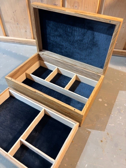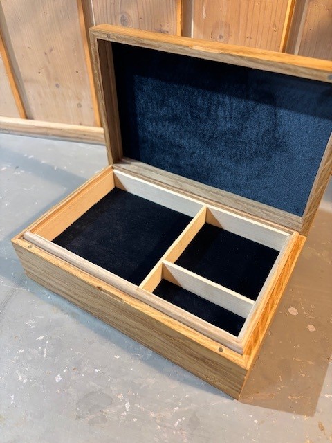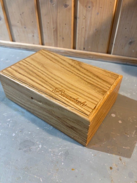 Dette skrinet til er litt større enn nr.1, og prisen er inklusive gravering. Eik med blått stoff.