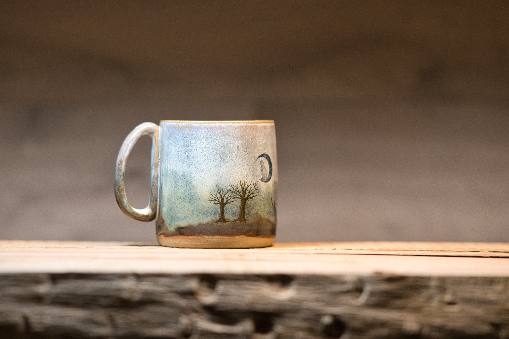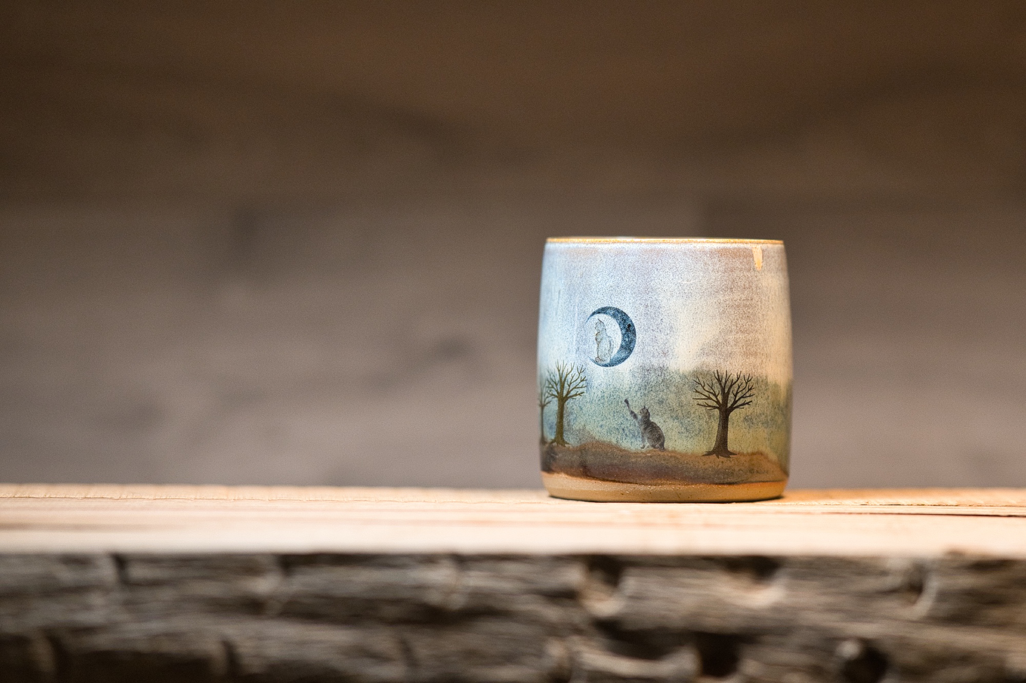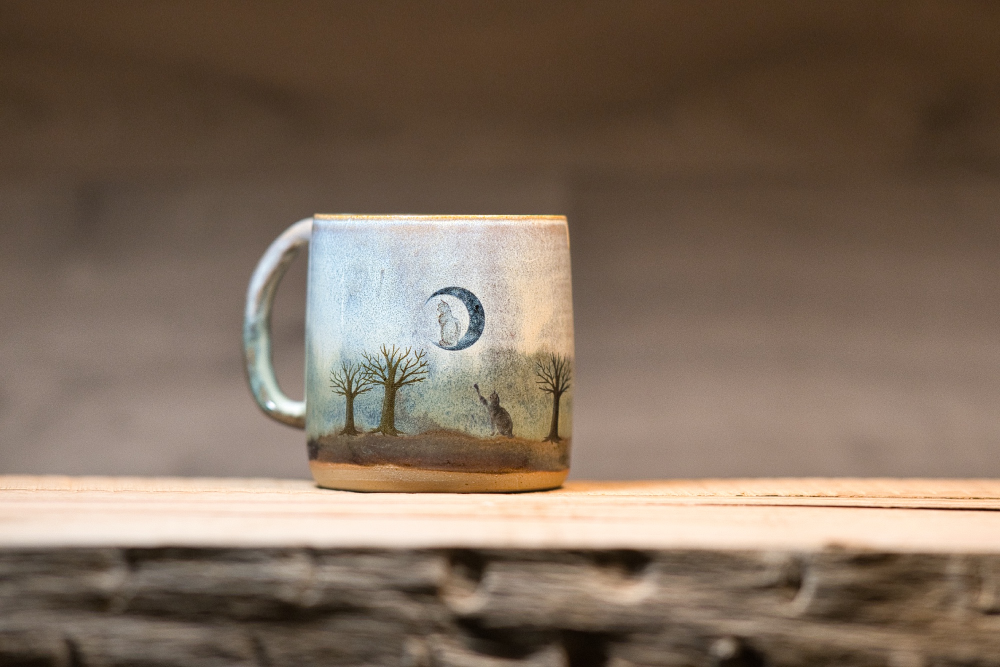 Keramický hrnek s poetickou a snovou ilustrací noční krajiny. Motiv zobrazuje kočku stojící na tichém kopci a natahující se k měsíci visícímu na klidné obloze. Holé stromy a jemné barevné přechody vytvářejí atmosféru ticha, tajemna a jemné magie noci. Teplé tóny ve spodní části hrnku evokují zemitost a klid, zatímco měsíc dodává scéně snový, téměř pohádkový nádech. Hrnek je ideální pro večerní čaj, chvíle klidu a tichého zamyšlení, kdy se den pomalu mění v noc.
