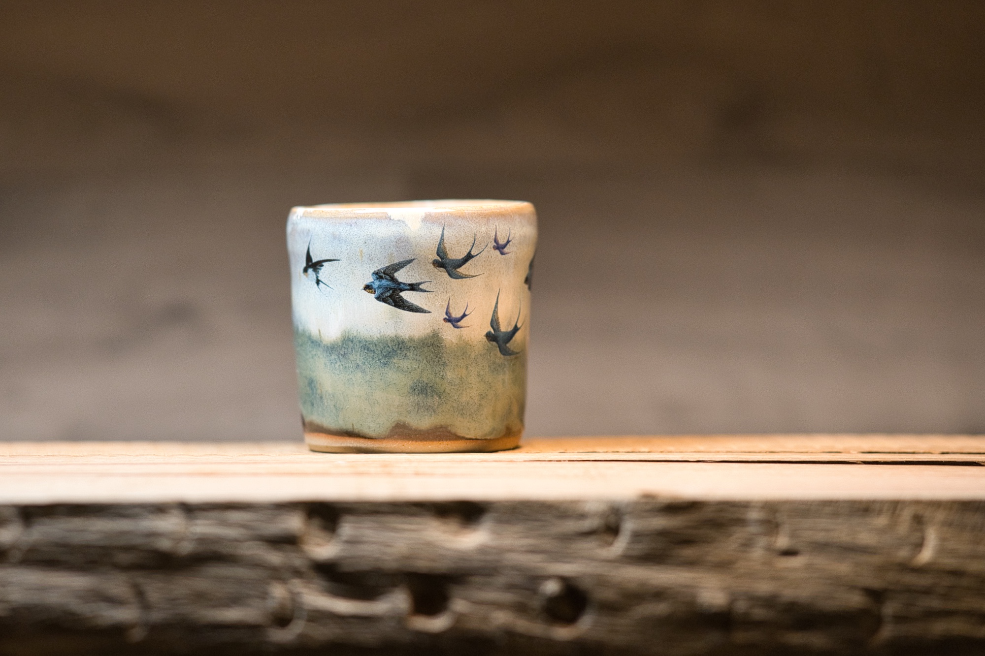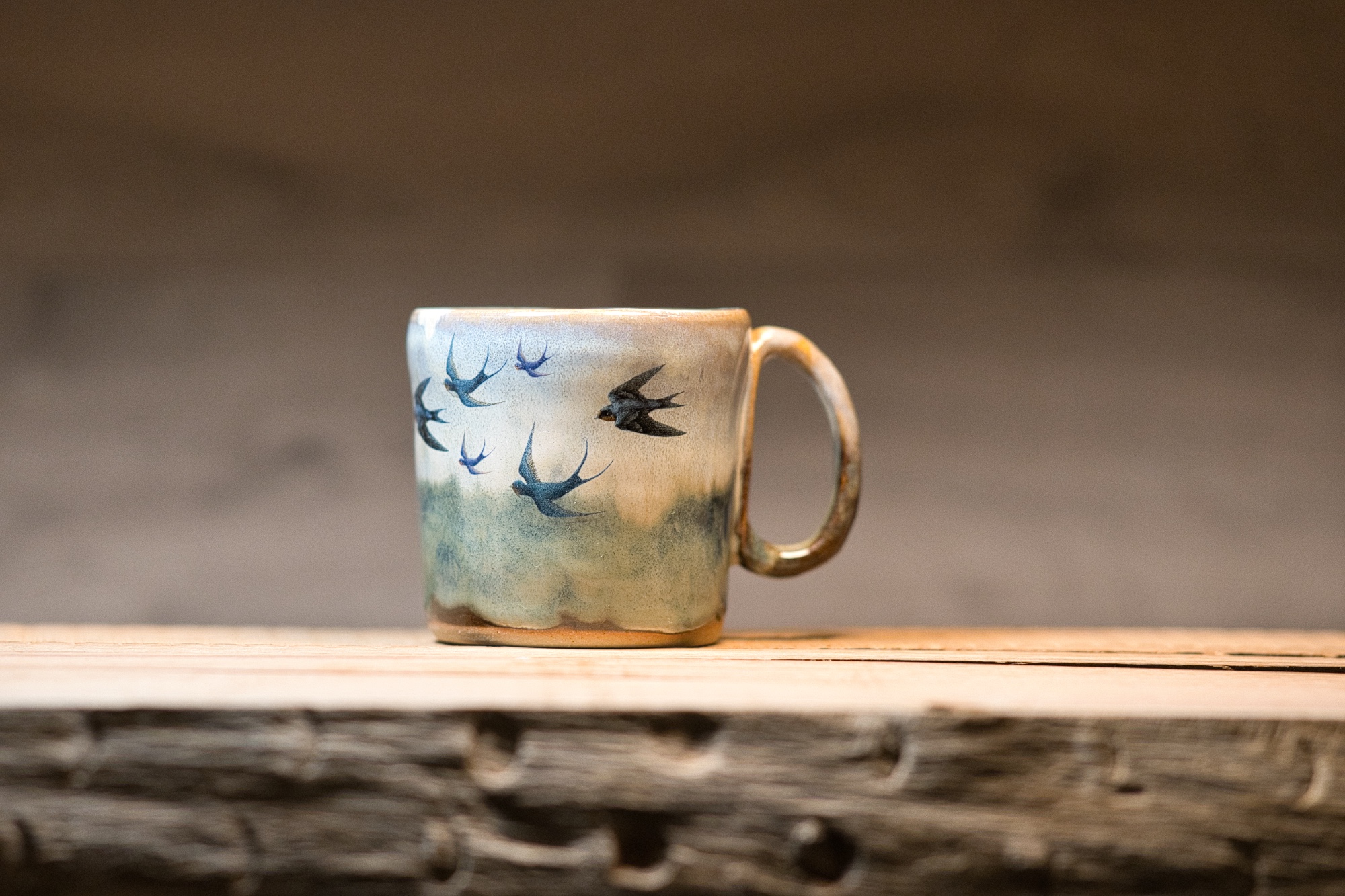 En håndlaget keramikkopp med en delikat illustrasjon av svaler i flukt, fanget over et rolig landskap i dempede naturtoner. Motivet symboliserer frihet, letthet og bevegelse, mens det håndverksmessige uttrykket og den lett rustikke glasuren gir hver kopp et personlig og varmt preg.